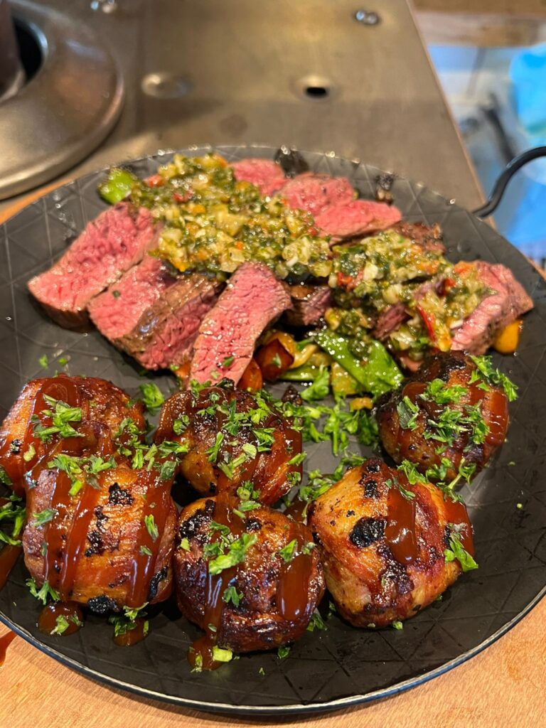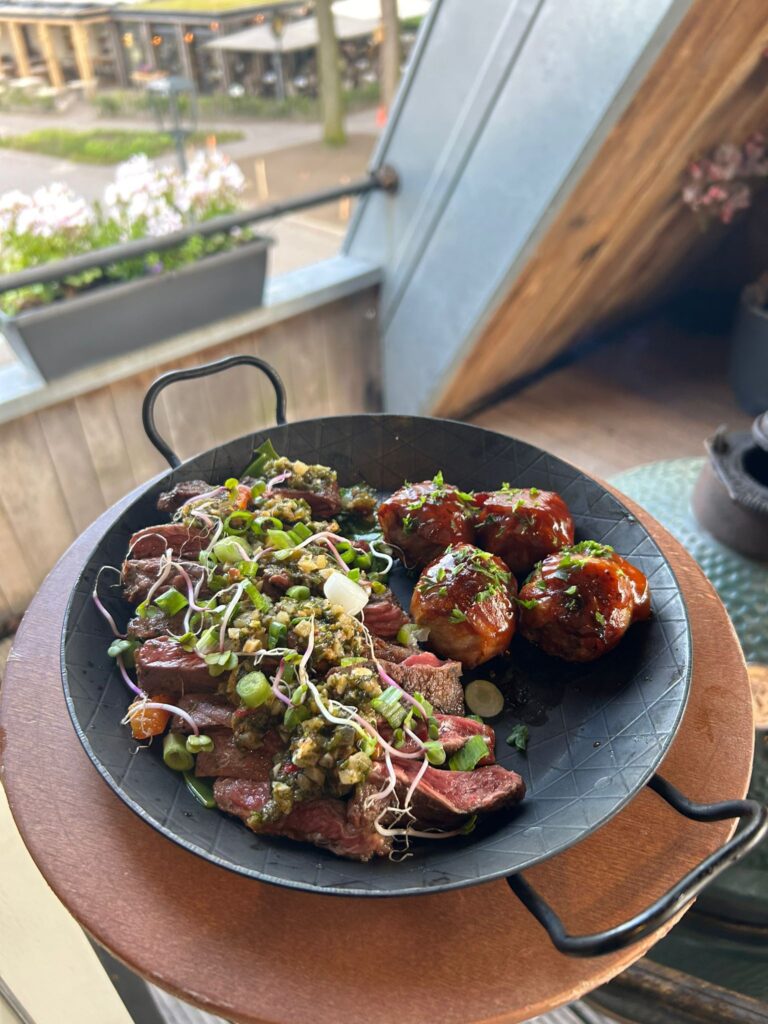 – Gemarineerd beef spiesje pepersaus