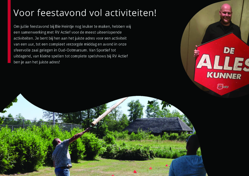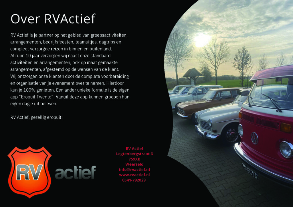RV Actief is uw partner op het gebied van groepsactiviteiten, arrangementen, bedrijfsfeesten, teamuitjes, dagtrips en compleet verzorgde reizen in binnen- en buitenland. Al ruim 10 jaar verzorgen wij, naast onze standaard activiteiten en arrangementen, ook op maat gemaakte arrangementen. Deze zijn afgestemd op de wensen van de klant. Wij ontzorgen onze klanten door de complete voorbereiding en organisatie van uw evenement over te nemen. Hierdoor kunt u 100% genieten.