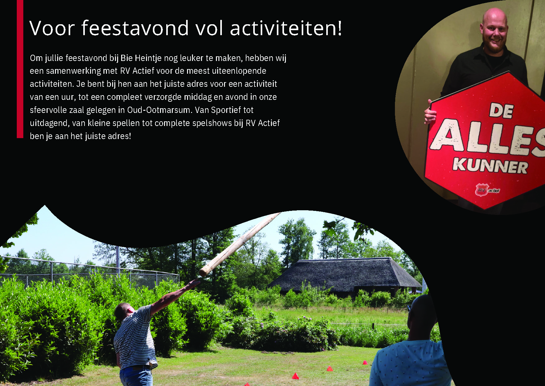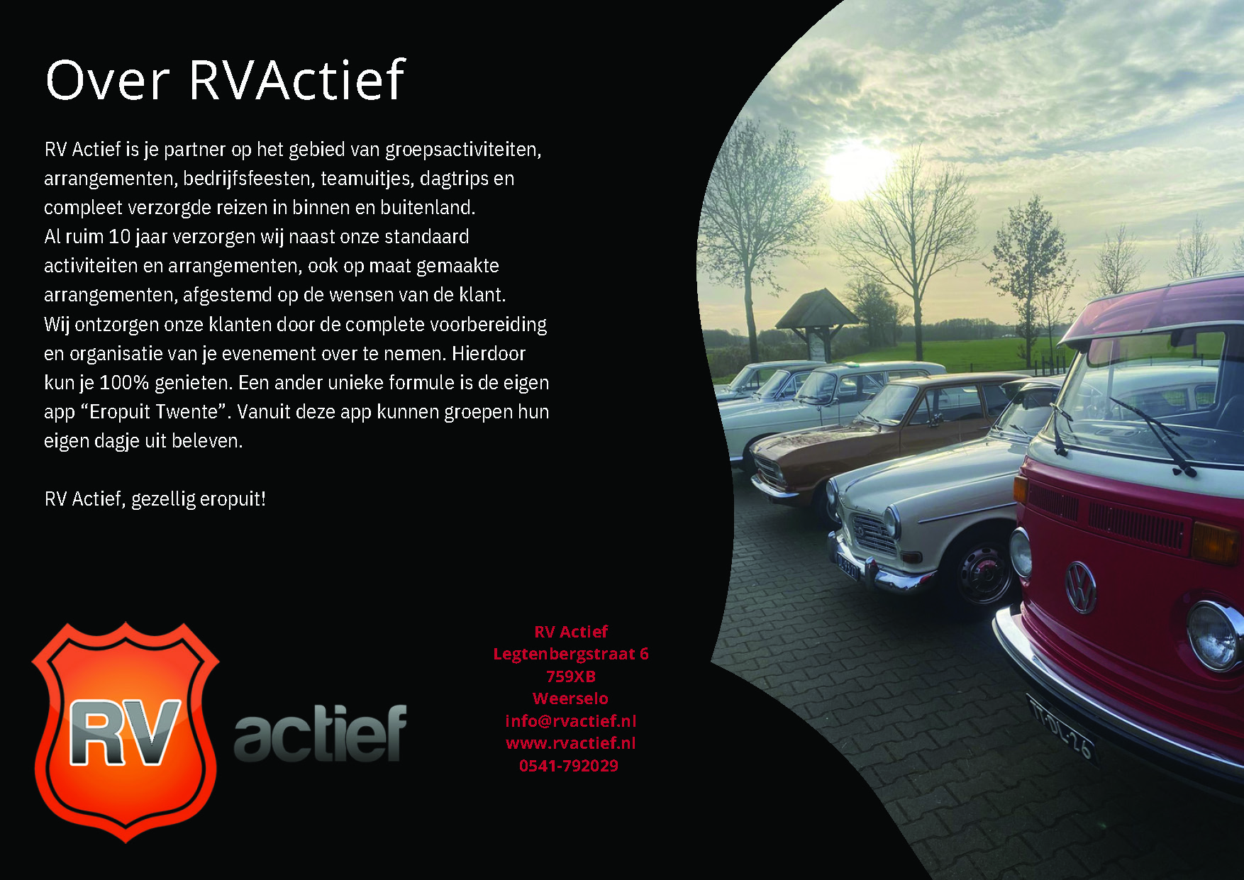 RV Actief is uw partner op het gebied van groepsactiviteiten, arrangementen, bedrijfsfeesten, teamuitjes, dagtrips en compleet verzorgde reizen in binnen- en buitenland. Al ruim 10 jaar verzorgen wij, naast onze standaard activiteiten en arrangementen, ook op maat gemaakte arrangementen. Deze zijn afgestemd op de wensen van de klant. Wij ontzorgen onze klanten door de complete voorbereiding en organisatie van uw evenement over te nemen. Hierdoor kunt u 100% genieten.